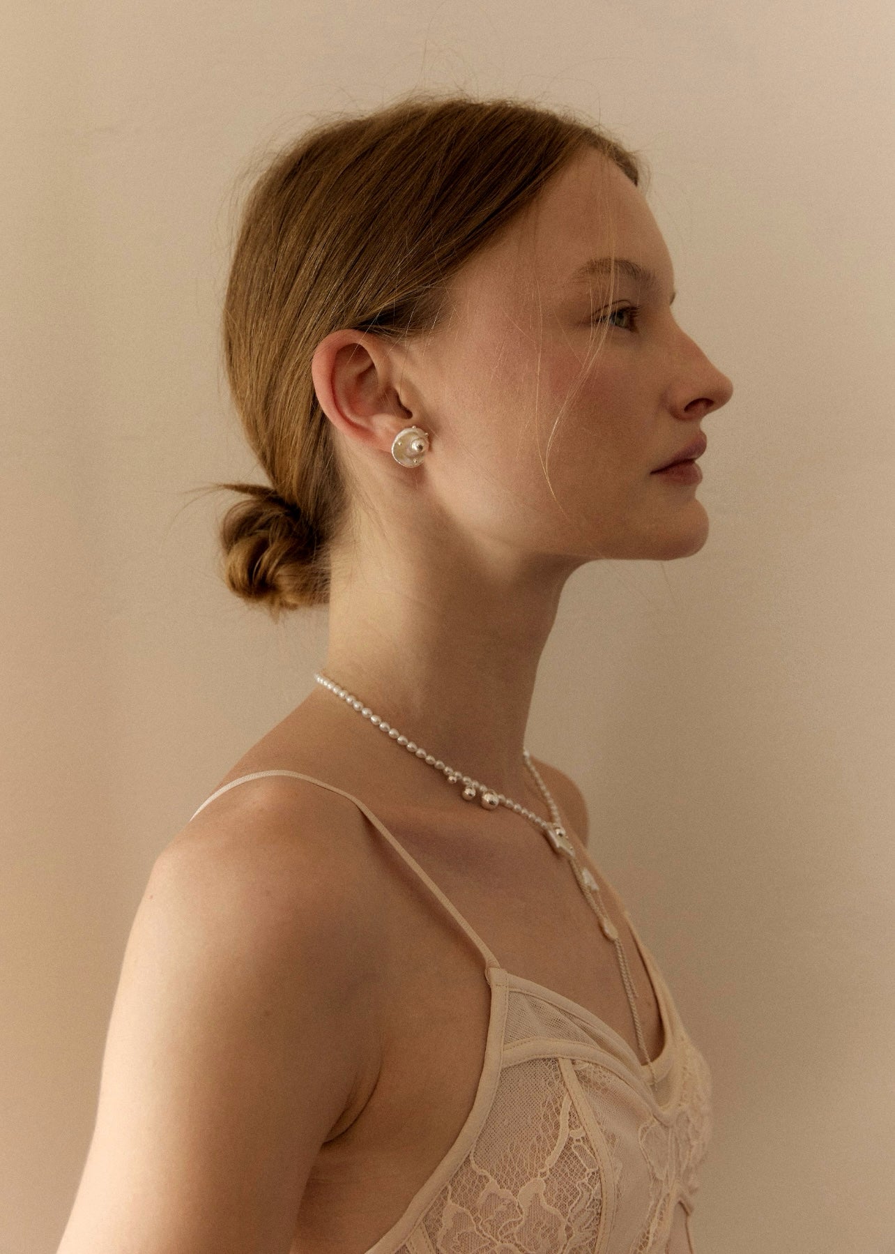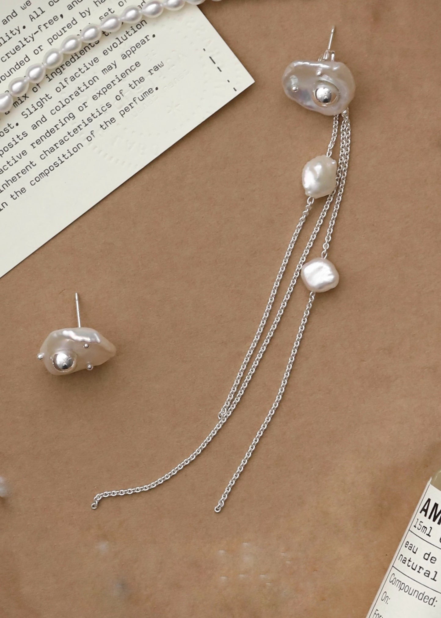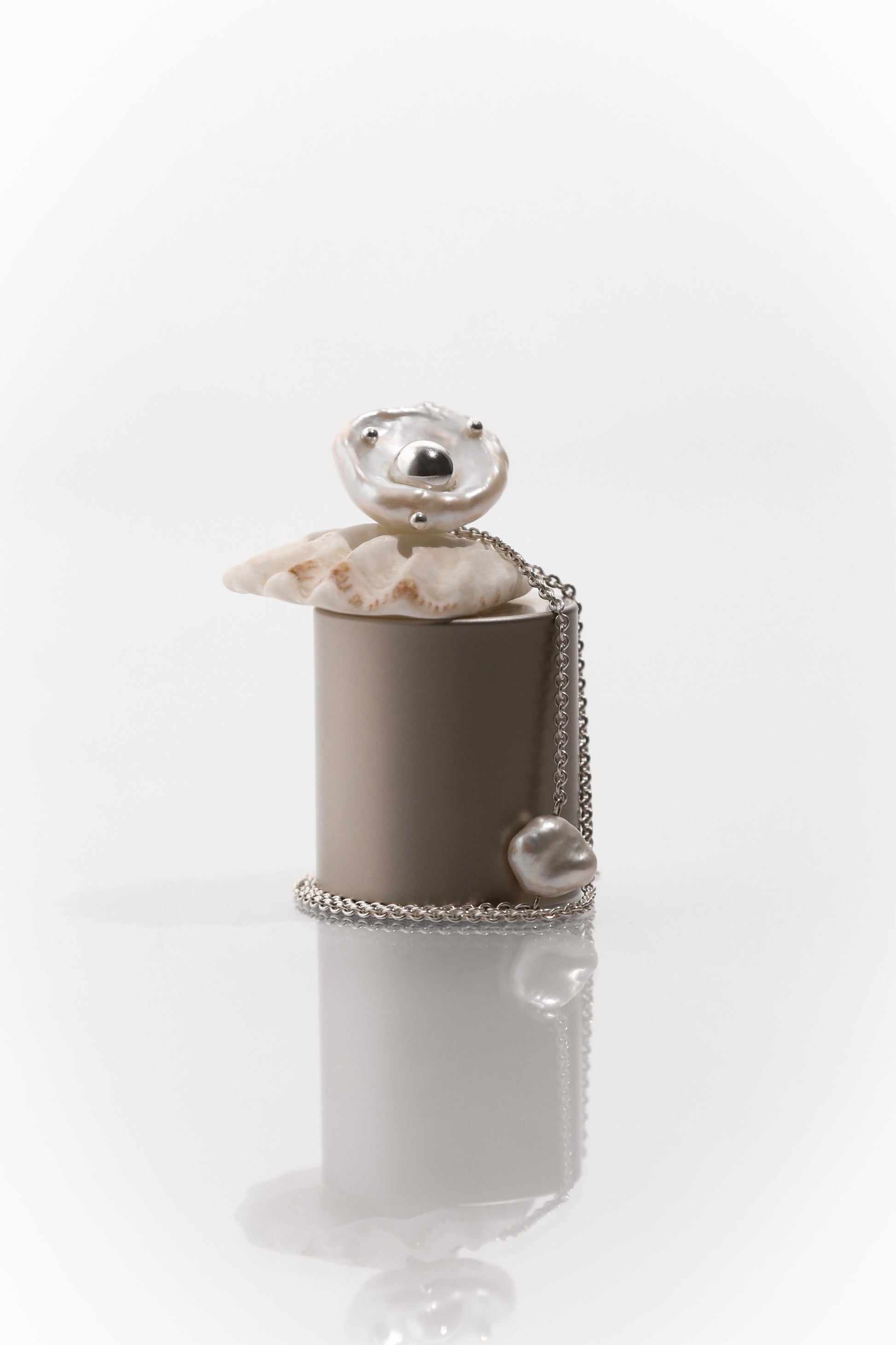 Білі барокові перлини, ніби витягнуті з морської глибини, інкрустовані срібними краплями — наче сліди води на шовку.