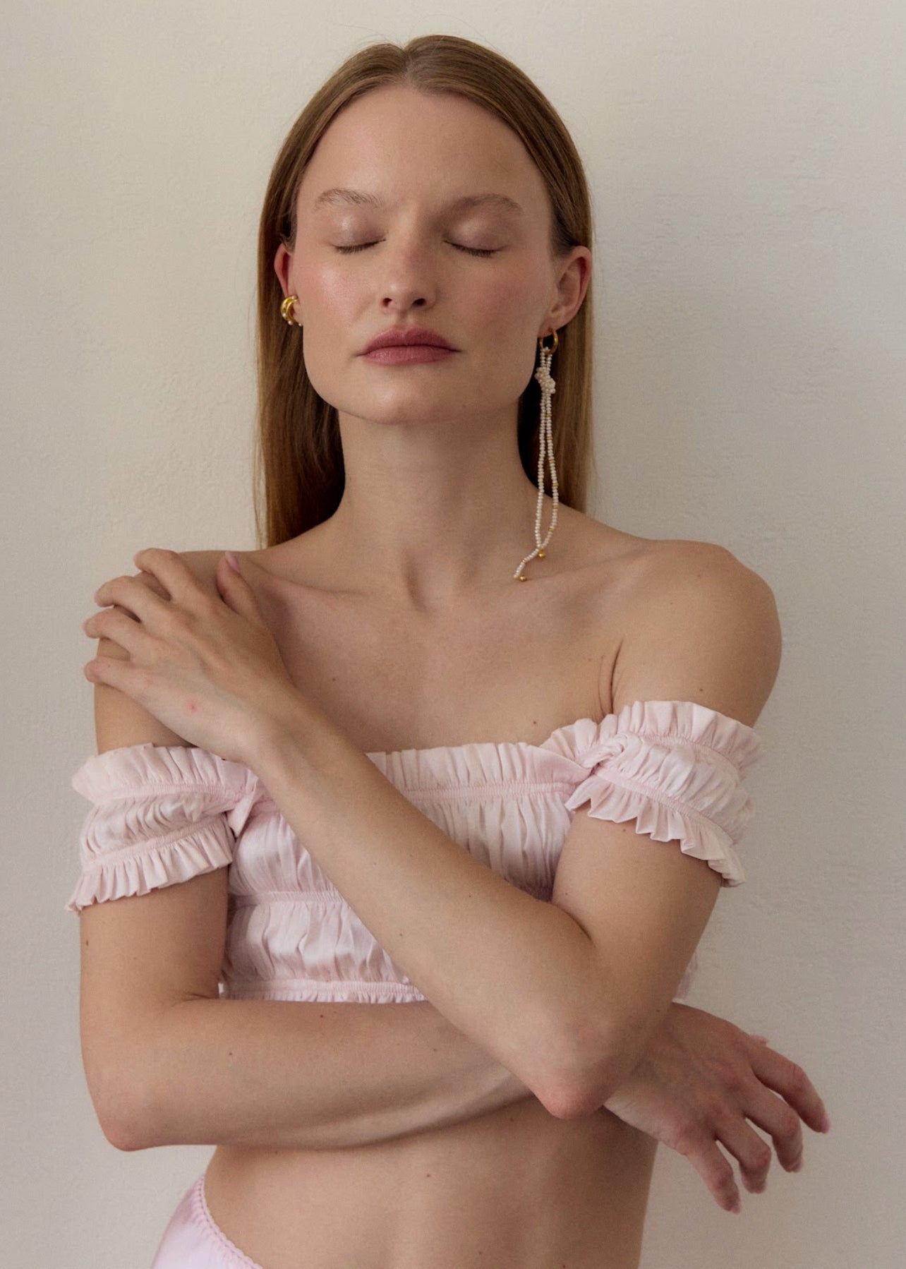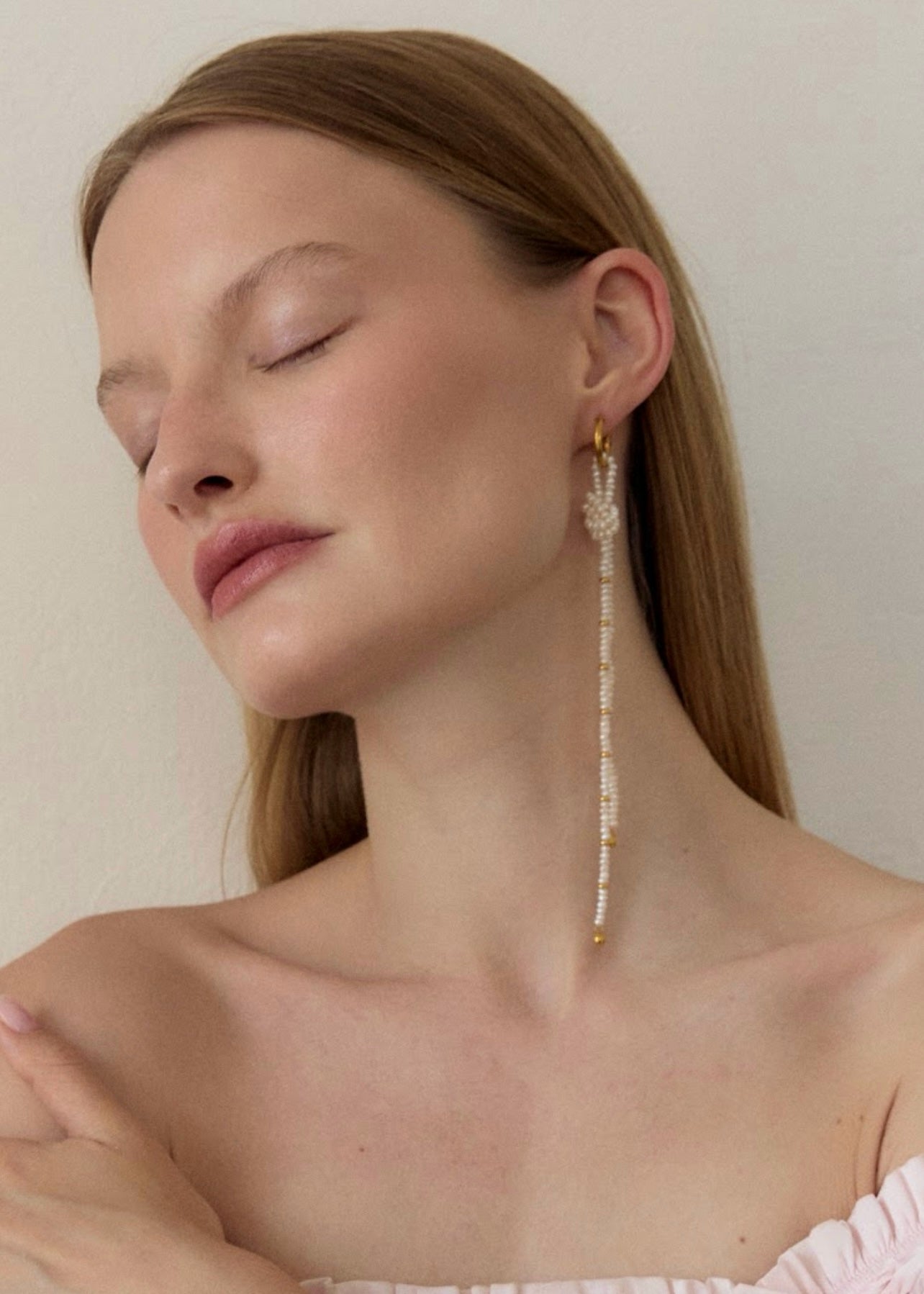 A string of gray pearls is tied in a knot on a vermeil hoop.
