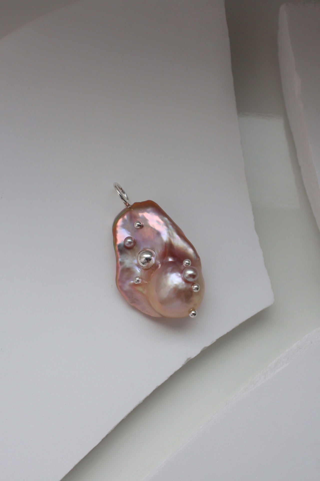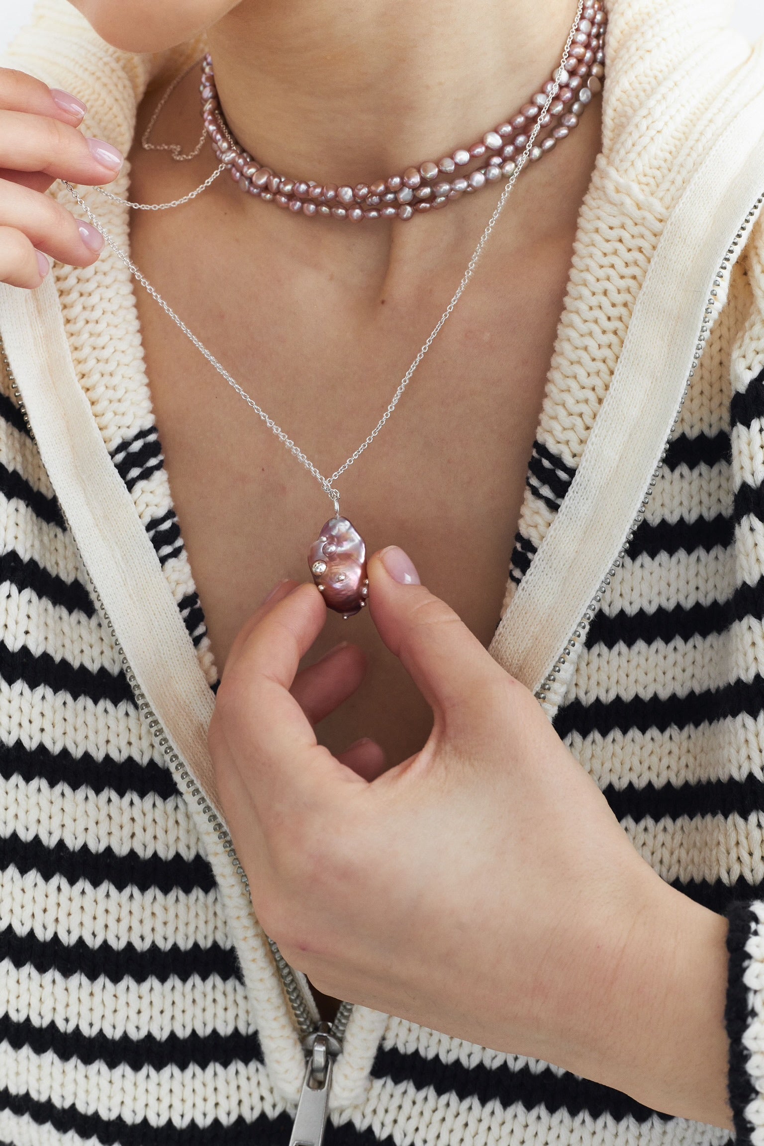 Ланцюжок з бароковою перлиною пурпурового відтінку інкрустованою каплями срібла та мініатюрними перлинами.