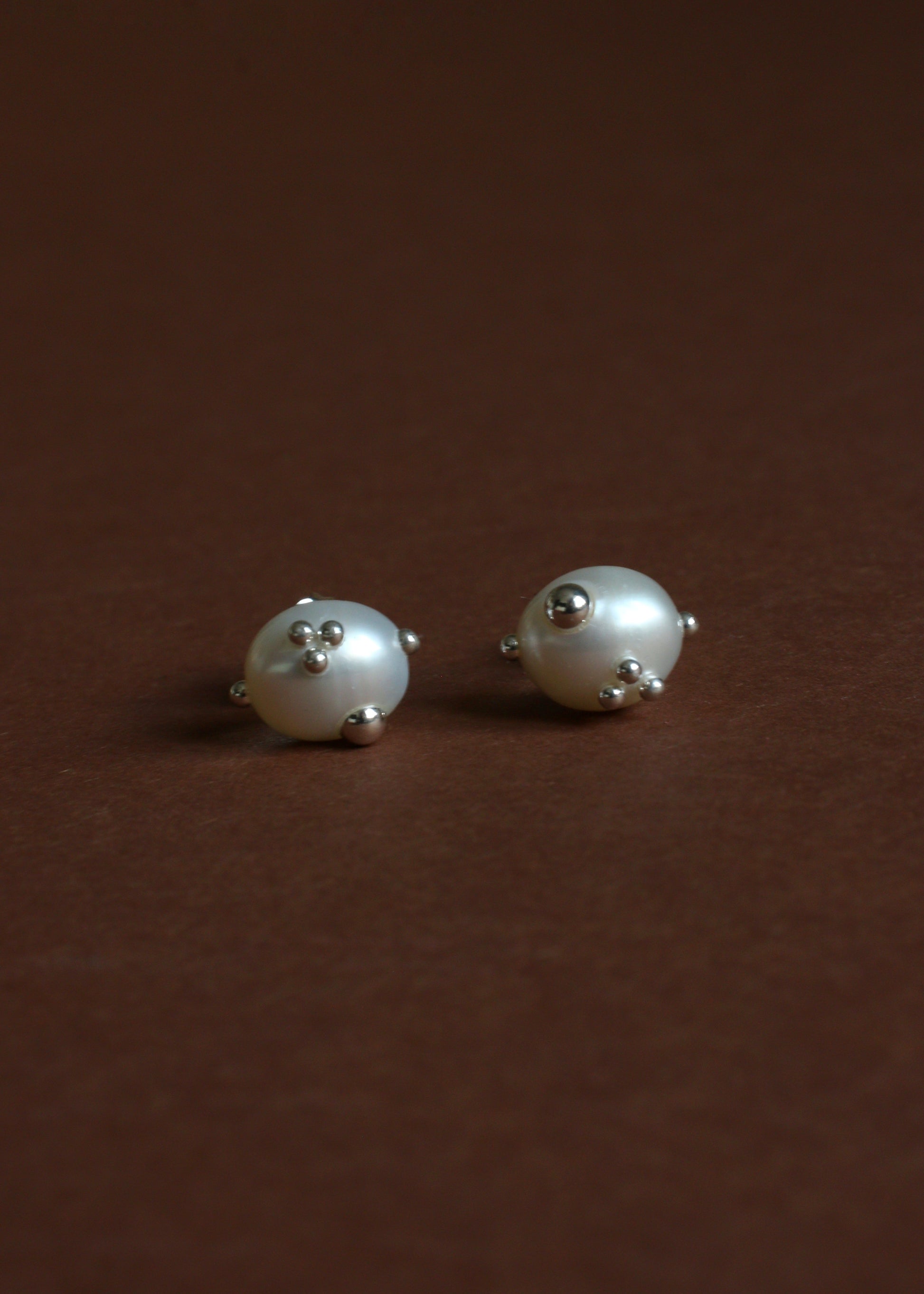 Сережки-цвяшки з білих барокових міні перлин, інкрустованих каплями срібла.