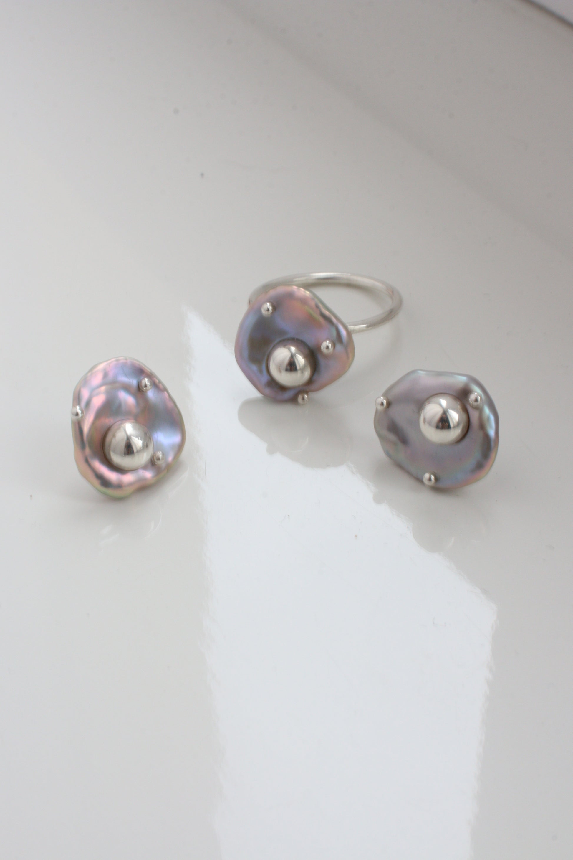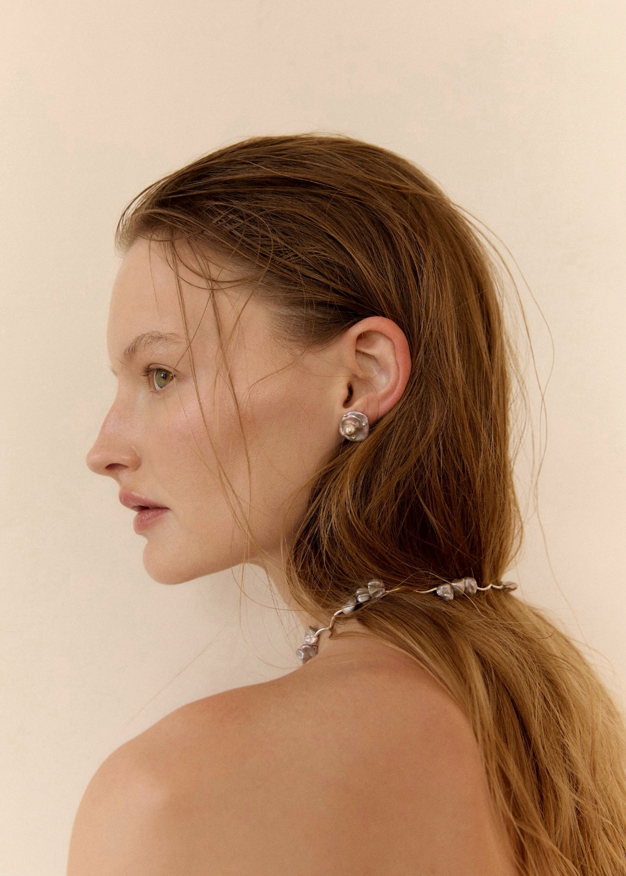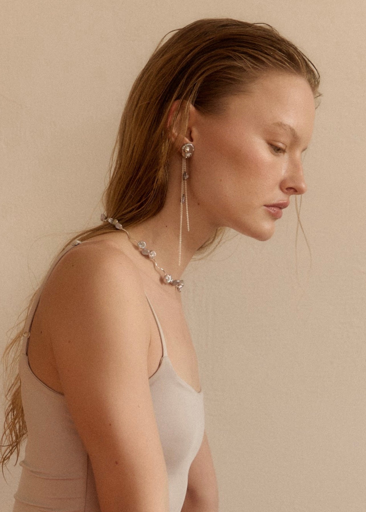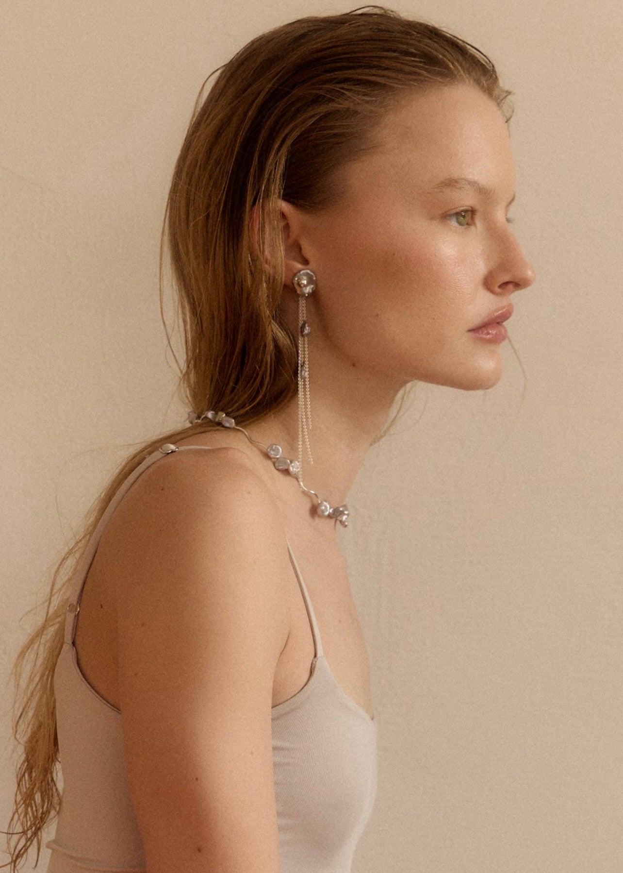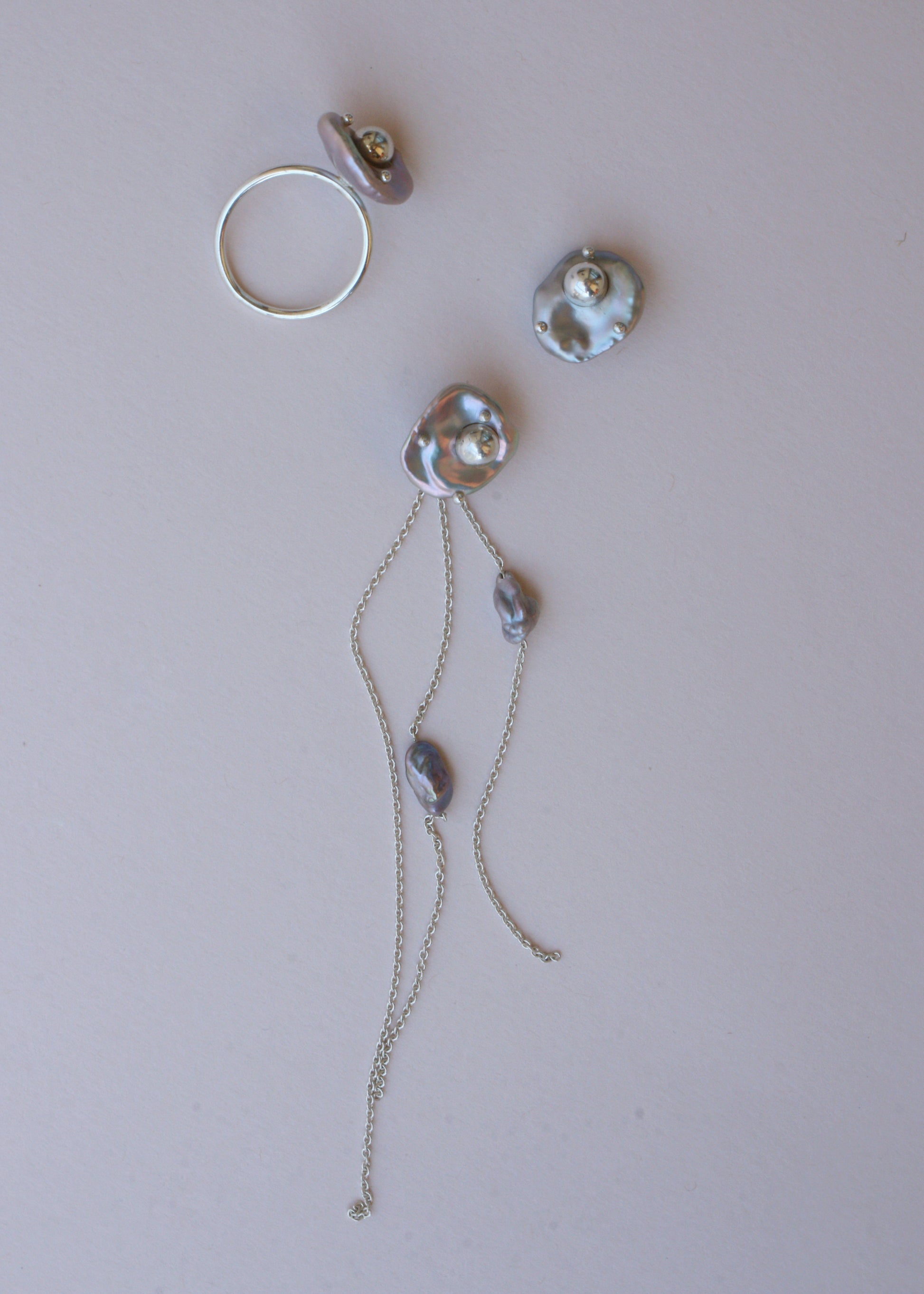 Сірі барокові перлини, ніби витягнуті з морської глибини, інкрустовані срібними краплями — наче сліди води на шовку.