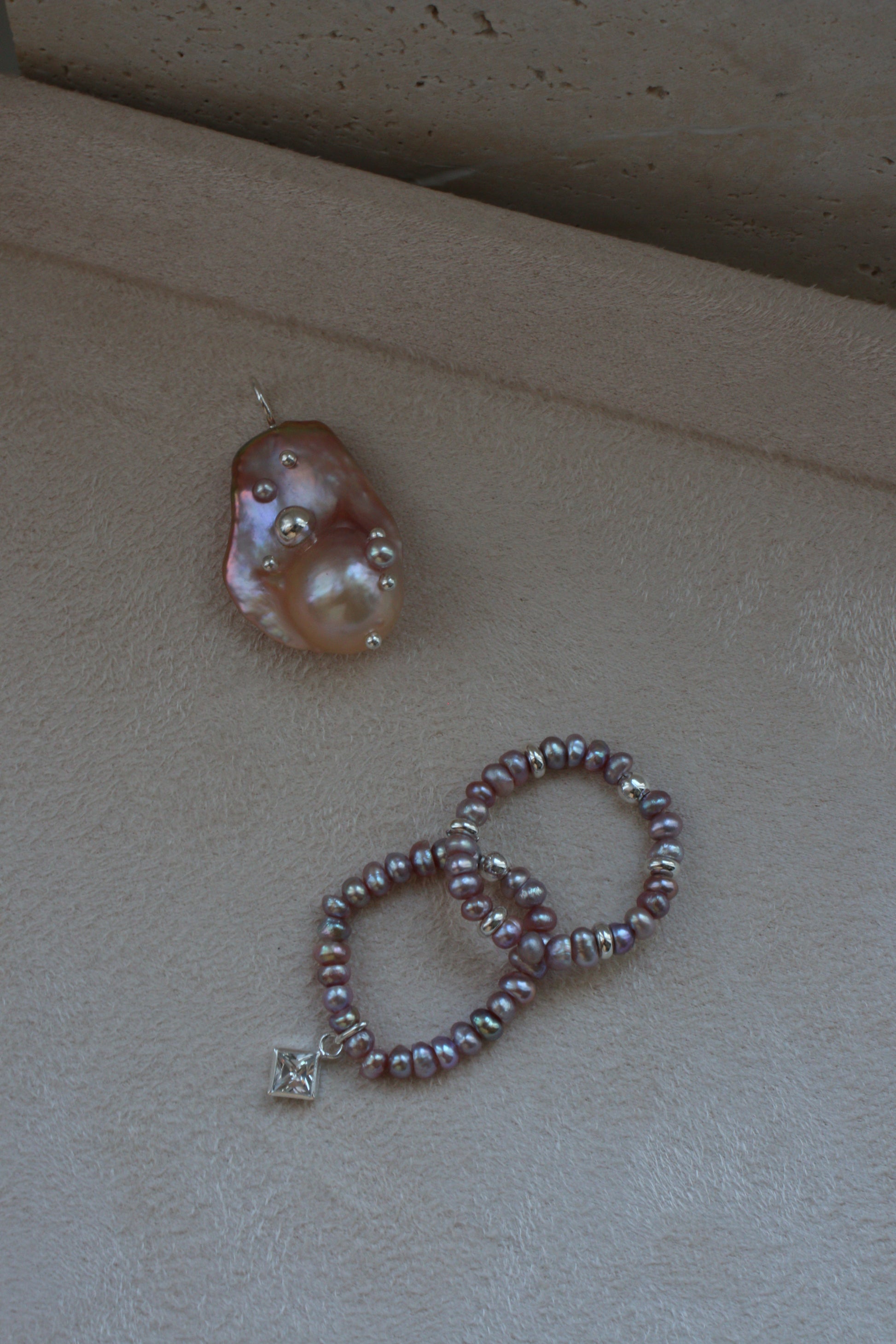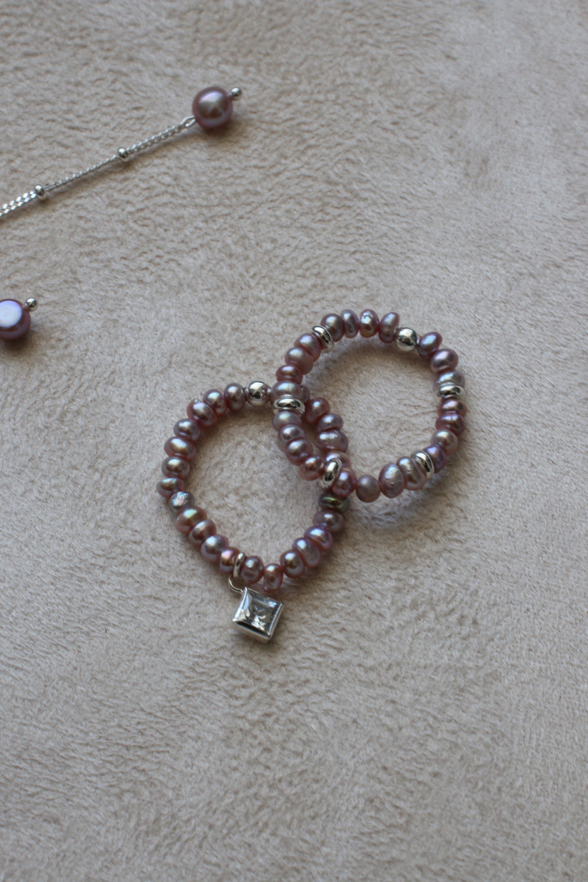 Сет з двох каблучок з пурпурових перлин. Одна з яких доповнена срібними намистинами, друга - ромбовидним підвісом з фіанітом.