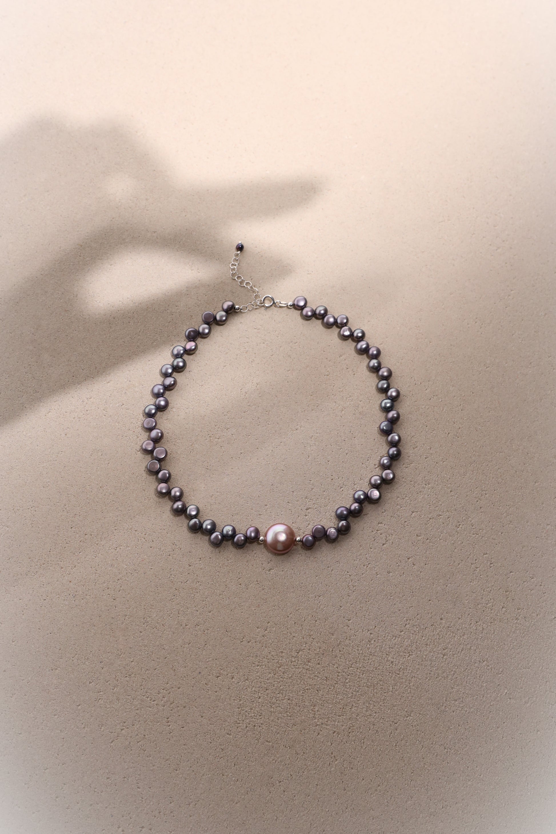 Чокер з натуральних перлин темних відтінків доповнених круглою перлиною.