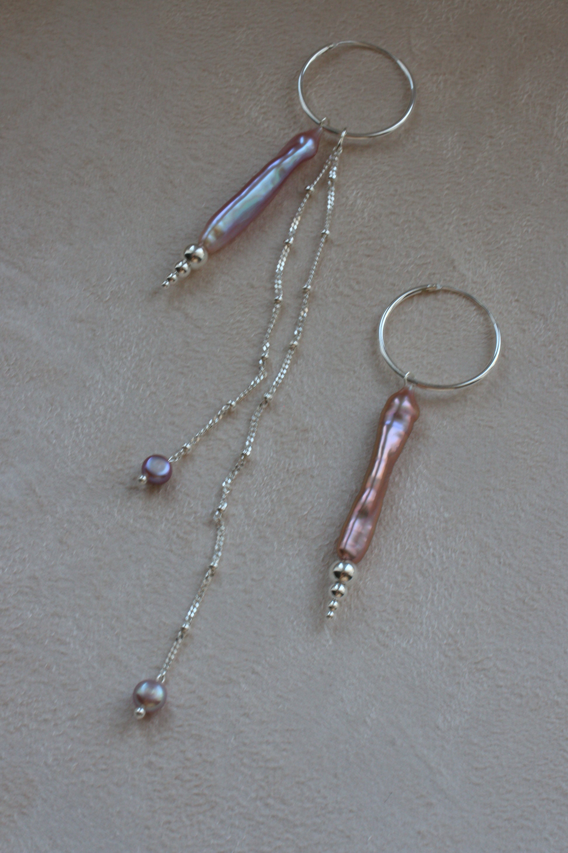 Асиметричні сережки кільця з динамічними ланцюжками та перлинними підвісами.